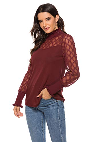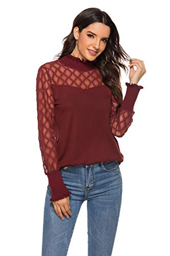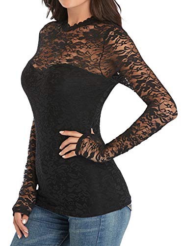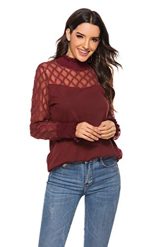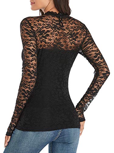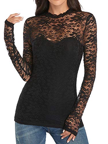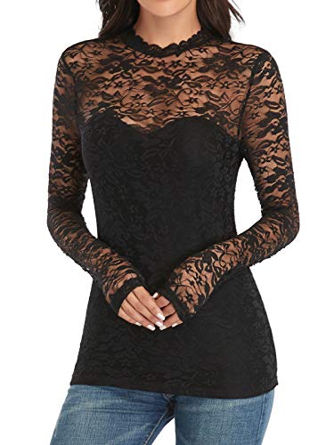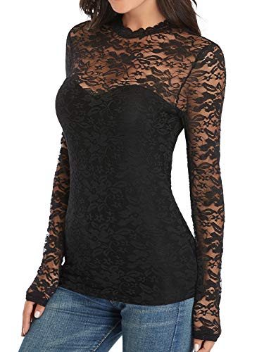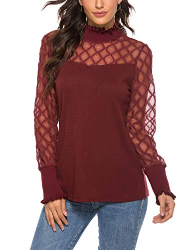 iWoo Blusa de malla de encaje elegante para mujer, con cuello alto y cuello redondo y corte entallado