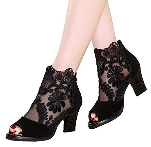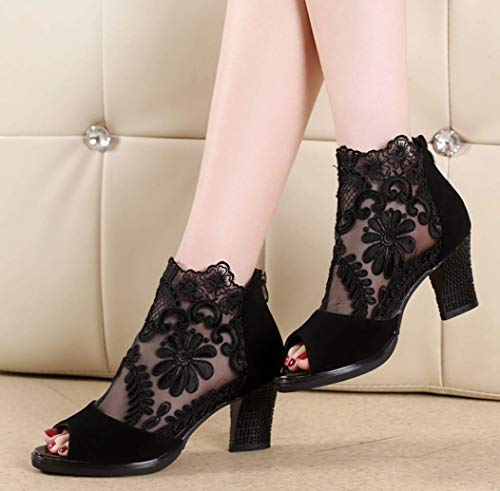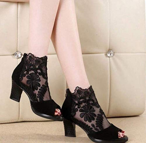 UMOOIN Botines de la Mujer, Flor de Malla de Encaje de inserción Chunky de tacón Botas Abiertas Sandalias de Punta Volver Partido de la Cremallera Zapatos,Negro,35