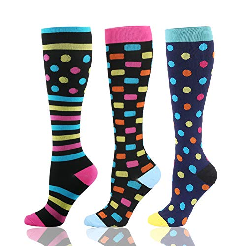 HLTPRO Calcetines de compresión para mujeres y hombres circulación, paquete de 3 calcetines hasta la rodilla para enfermeras, correr, viajes, embarazo, S-M, Morado/azul/amarillo.