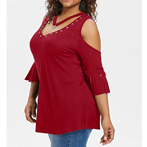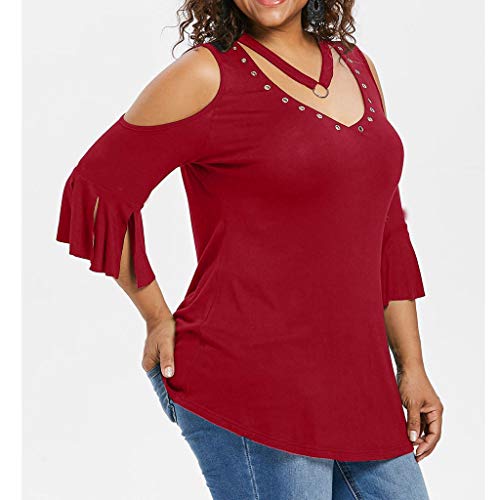 VEMOW Tops Mujer Tallas Grandes Moda para Mujer Camiseta de Manga Corta Chaleco con Cuello en v Remache Blusa(Rojo,4XL)