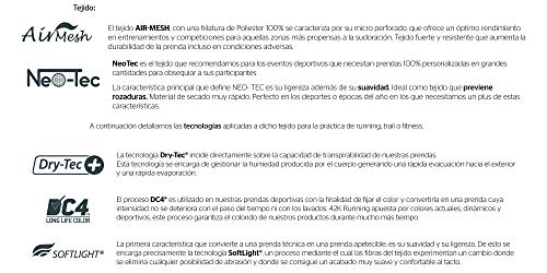 - Tejido AIR-MESH + NEOTEC 2.0 La característica principal que define NEO- TEC es su ligereza además de su suavidad. Ideal como tejido que previene rozaduras. Material de secado muy rápido. El tejido AIR-MESH, con una hilatura de Poliester 100% se caracteriza por su micro perforado, que ofrece un óptimo rendimiento en entrenamientos y competiciones para aquellas zonas más propensas a la sudoración. Tejido fuerte y resistente que aumenta la durabilidad de la prenda incluso en condiciones adversas.