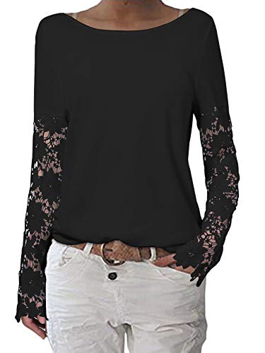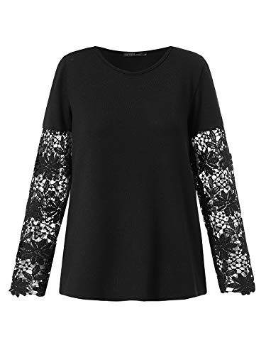ZANZEA Mujer Camisetas Tallas Grandes Cuello Redondo Manga Larga Pullover Casual Tops Jersey Holgada Encaje Negro L