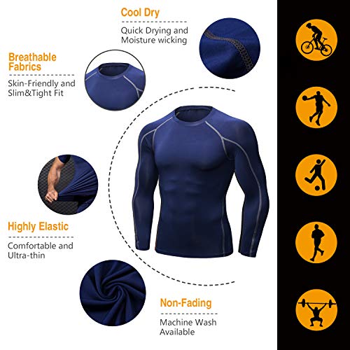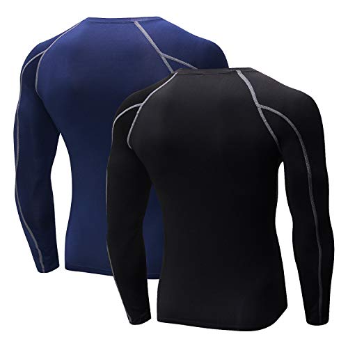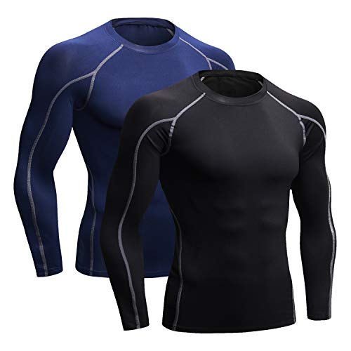 Niksa 2 Piezas Camisetas de Fitness Compresión Ropa Deportiva Manga Larga Hombre para Correr, Ejercicio,Gimnasio 1059 (Medium(Fit Chest 35.5"-37.5"), (Manga Larga) Negro Gris+Azul Marino)