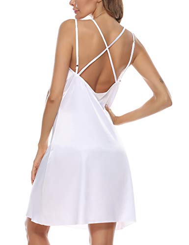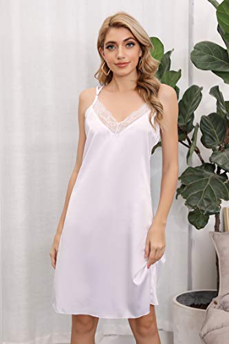 Doaraha Camisón Mujer Seda Sexy Satén Camisones Dormir Verano Ropa de Dormir Satín Encaje Tirantes Pijama Babydoll para Novia Sin Manga Correas Ajustables Suave (Blanco, S)