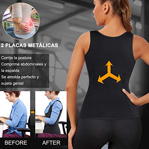 - Dos varillas blandas da soportes suficientemente a la espalada, moldea el abdomen y corrije la postura. Puede ajustar la sauna chaleco neopreono a tu cuerpo gracias al diseño de velcro, además hace que sudes debido a su tejido neopreno mujer.