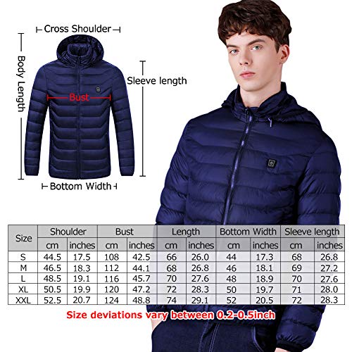 - Acerca de las tallas: te recomendamos que mires primero la tabla de tallas para asegurarte de que la chaqueta caliente se ajuste bien. Si quieres que sea más suelto, elige una talla más grande. Nota: 1. Desconecta el Power Bank cuando no se utiliza la chaqueta de invierno durante mucho tiempo. 2. No lavar con agua caliente y detergente ácido
