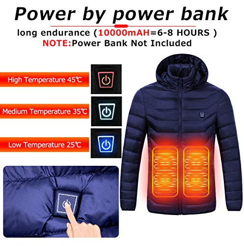 - Fácil de usar: 3 niveles de regulación de temperatura inteligente con un solo botón, se puede ajustar la necesidad de calor según tus necesidades. Conecta el puerto USB a la batería externa y listo. La chaqueta de invierno es lavable a mano y lavable a máquina, fácil de limpiar (Nota: la batería externa no está incluida en el envío)