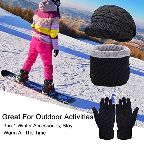 CheChury Gorras Invierno con Bufanda y Guantes Mujer Moda Calentar Sombreros Gorras de Punto Forro de Lana Guantes Táctiles Deportes de Invierno