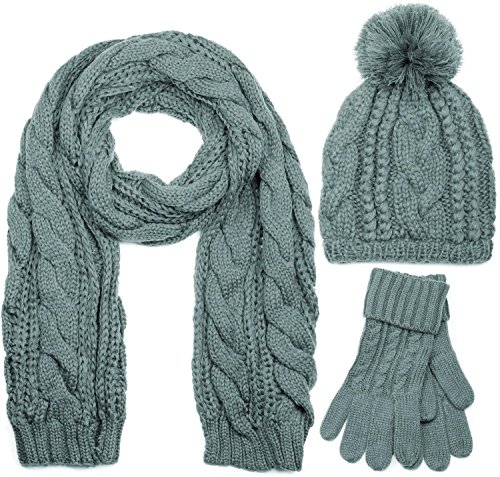 styleBREAKER conjunto de chal, gorro y guantes, chal de punto con motivo trenzado con gorro con pompón y guantes, señora 01018208, color:Gris/bufanda