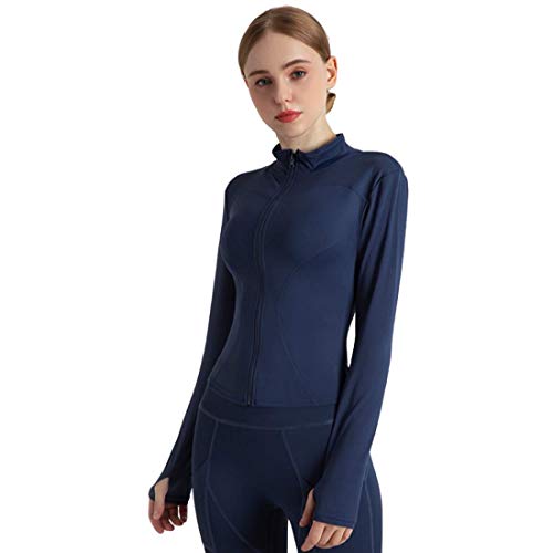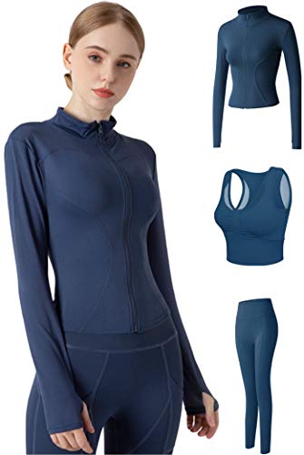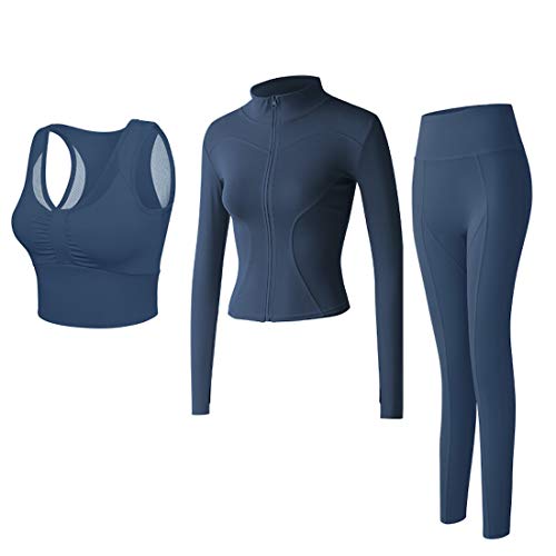 Conjunto Yoga 3 Piezas Ropa Fitness Entrenamiento, Top Pantalones y Chaqueta de Yoga Súper Elásticos. Leggings+Bralette para Mujer+Chaqueta de Manga Larga Mujer (Azul, S)