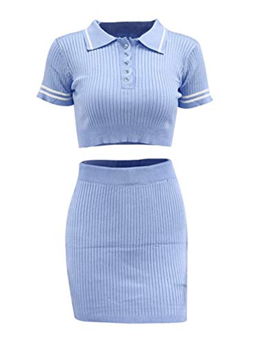 Conjunto de Falda de 2 Piezas de Punto para Mujer Botones a Rayas Top Corto de Manga Corta Falda sin Tirantes de Cintura Alta Traje Informal