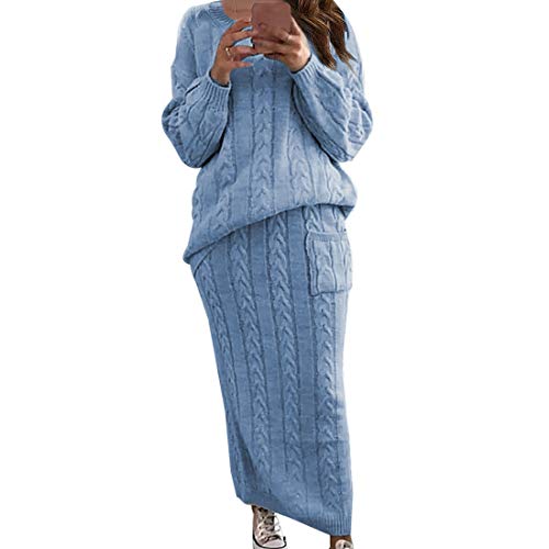 Shujin Conjunto de 2 piezas para mujer, traje de punto grueso, suéter y falda maxi de punto con patrón trenzado, bodycon, traje informal de dos piezas azul XXL