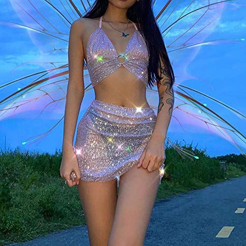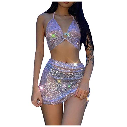 VEMOW Vestido Mujer Conjunto de Top de Tubo de Falda Corta, Moda Sexy Trajes de Baño de Playa Backless Ombligo con Cordones Perspectiva Conjunto de Seda Brillante(Rosa,S)