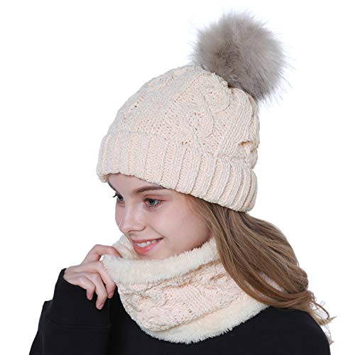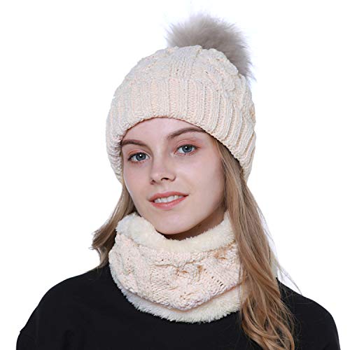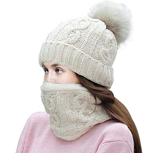 Tacobear Gorro Invierno Mujer y Bufanda Círculo Sombreros de punto Mujer Caliente Gorros de punto con Pompón Cuello Gruesa Bufanda Invierno Bufanda de Punto para Mujer (beige)