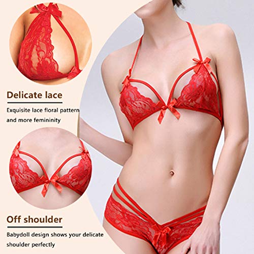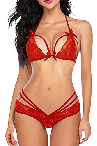 heekpek Conjuntos de Lencería Mujer Encaje Atractivo Ropa de Dormir Correa Cuello V Sin Espalda Ropa Interior Sexy