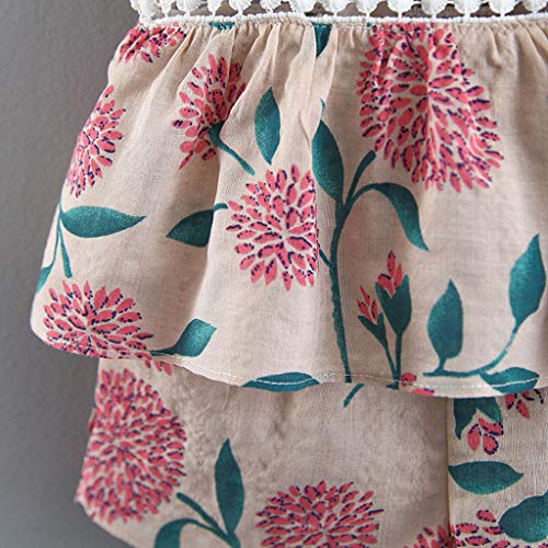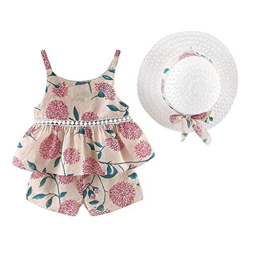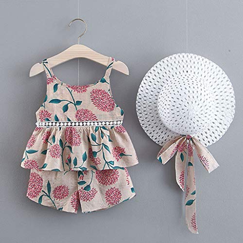 YWLINK Conjuntos NiñA,Top Sin Mangas Manga Corta con Camiseta Volantes Y Estampado Floral+Pantalones Cortos+Sombrero De Paja Conjunto De 3 Piezas Lindo Vestido De Fiesta(Rosado,3-4 años/120cm)