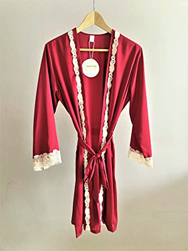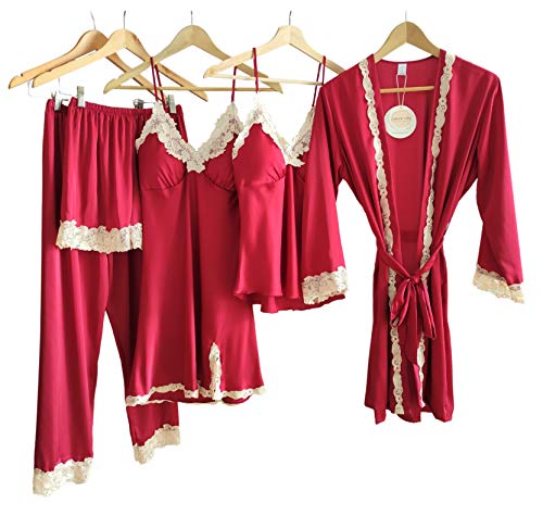 Laura Lily - Pijamas Mujer de Seda Satén y Color Liso con Encaje Dorado Conjunto de 5 Piezas (Rojo Burdeos, M-L)