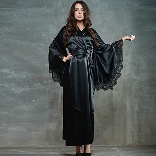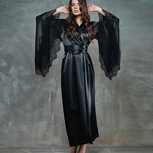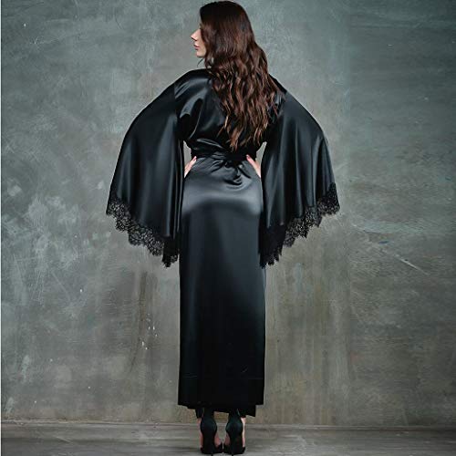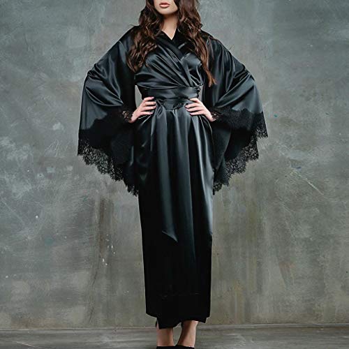 KIMODO Mujeres Sexy Encaje Satinado Kimono Bata Larga Albornoz Ropa Interior Ropa de Dormir Cinturón Pijamas Lencería Tentación con Medias Ropa Interior