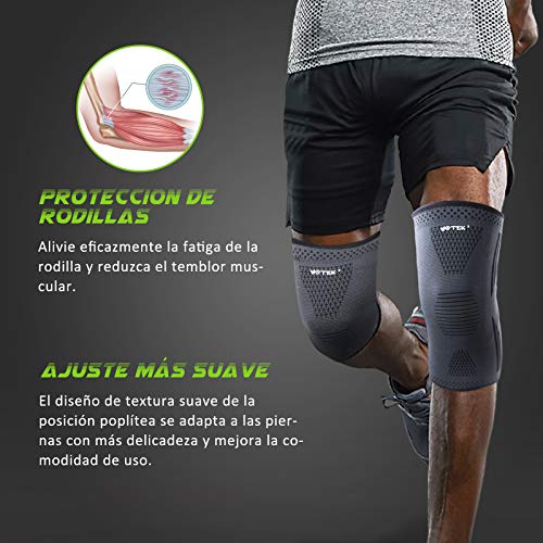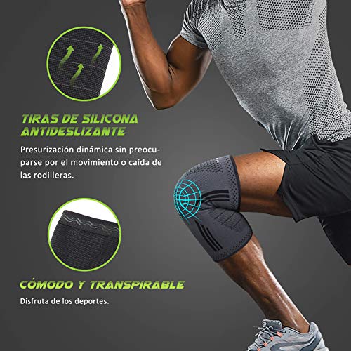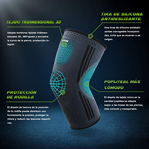 - ?【Mejor Rendimiento Deportivo】El exclusivo diseño ondulado de silicona antideslizante de doble capa se utiliza para evitar el deslizamiento y fijar la rodillera en su lugar.No necesita ajustes frecuentes y es adecuado para todos los deportes que ejercen presión sobre las articulaciones,como correr,baloncesto,fútbol,golf,ciclismo,tenis,senderismo,voleibol,esquí, levantamiento de pesas,etc.También se puede utilizar para acelerar la recuperación, proteger las heridas y aliviar el dolor,etc.