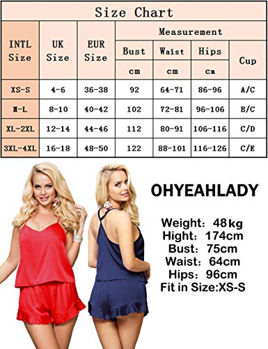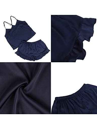 - DISEÑO CLÁSICO: La camiseta satinada de escote v con los tirantes finos ajustables combinan con los pantalones cortos de satén con volantes bonitos que te dan un toque diferente a cualquier look de pijama y aunque sea para dormir te sientes más guapa con este pijama puesto.