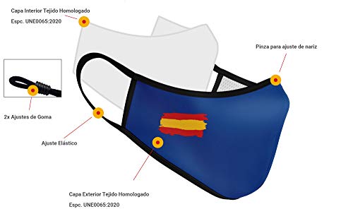 - MASCARILLA REUTILIZABLE: HOMOLOGADA según norma UNE 0065/2020 y normativa Europea CWA17553. Confeccionada con doble capa de tejido homologado según la norma UNE-0065/2020. No precisa de filtro. Goma elástica CON REGULADOR y ajustador interior no visible para la nariz.