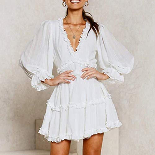 VEMOW Vestido Mujer Moda Gasa Volantes Manga Larga Cuello en V Partido Bodycon Delgado Mini Vestir OtoñO Summer(Blanco,M)