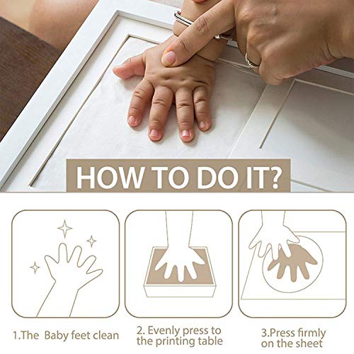- ?. Fácil de usar: simplemente presione la mano o el pie de su bebé contra la almohadilla de tinta y luego coloque una hoja de papel limpia. y la huella digital del recién nacido se puede colocar o colgar en la pared.