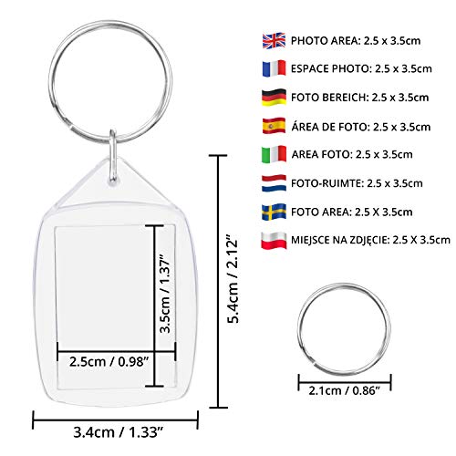 - 50 LLAVERO ACRILICO EN BLANCO: Este set de llaveros transparentes incluye 50 llaveros en blanco con cadena. Cada llavero portafotos está hecho de acrílico premium y mide 3,2 x 5,4 cm. Estos llaveros pueden contener fotos de hasta un tamaño de 2,5 x 3,5 cm. El aro de metal tiene un diámetro de 2,2 cm.