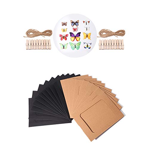 - ?En el paquete hay 10 piezas de bolsillos fotográficos negros y 10 piezas de bolsillos marrones, 20pcs pequeñas clavijas de madera, 2pcs cuerdas de yute / cuerdas, 2 piezas cinta de gasa, y 12 pcs mariposas de simulación de diferentes tamaños para vestir nuestra habitación