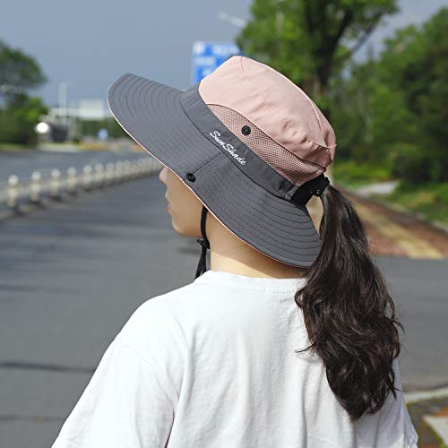 Sombrero de Sol al Aire Libre Mujer Sombrero de Cola de Caballo Plegable Gorro de Pescador Gorras de ala Ancha de Malla Sombrero de Verano Visor 56-58CM (Rosado)