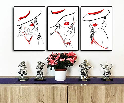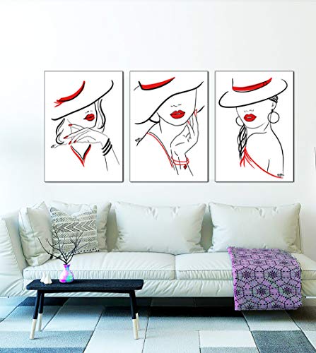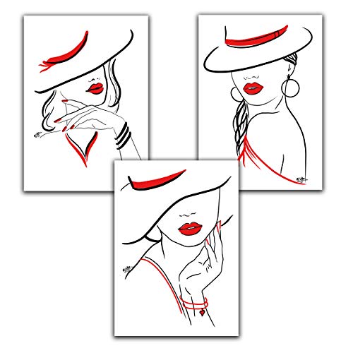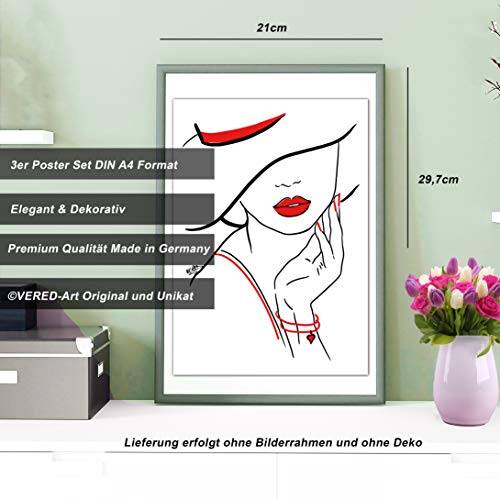 ©VERED Art - Juego de pósteres de línea, colores negro, blanco y rojo, modernos murales para salón, dormitorio, oficina, 3 x A4 sin marco, mujeres con sombrero