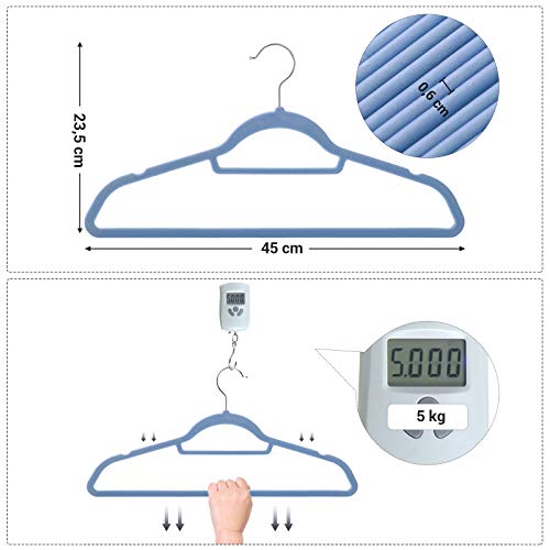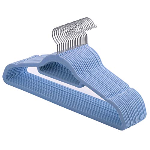 SONGMICS Perchas de Terciopelo, Paquete de 20, Antideslizantes, 0.6 cm Espesor, Espacio Mínimo, Ganchos Giratorios de 360°, 45 cm Ancho, para Abrigo, Chaqueta, Vestido, Pantalón, Azul Claro CRF20N