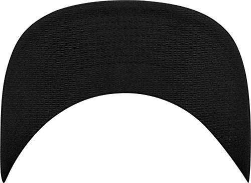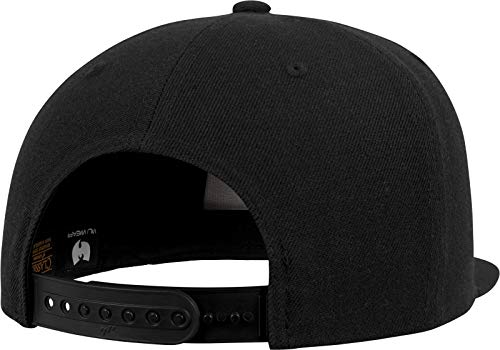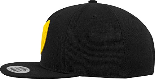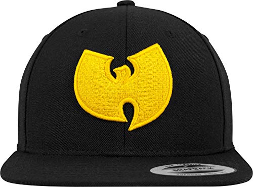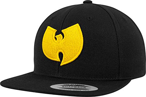 - Gorra clásica Yupoong Flexfit Snapback de color negro con cierre de plástico y llamativo logotipo bordado amarillo de Rap-Crew