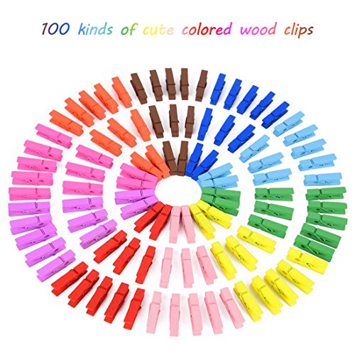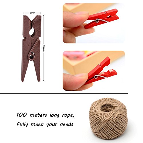 - ❤Set de mini pinzas de madera: el paquete incluye 100 piezas coloreada pinzas de arte (10 colores diferentes) y cordeles de yute de 100 metros.
