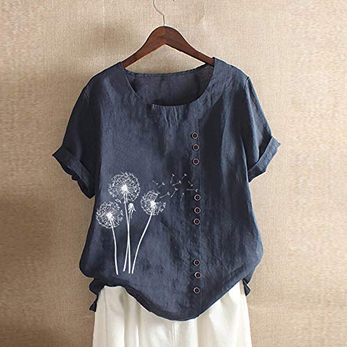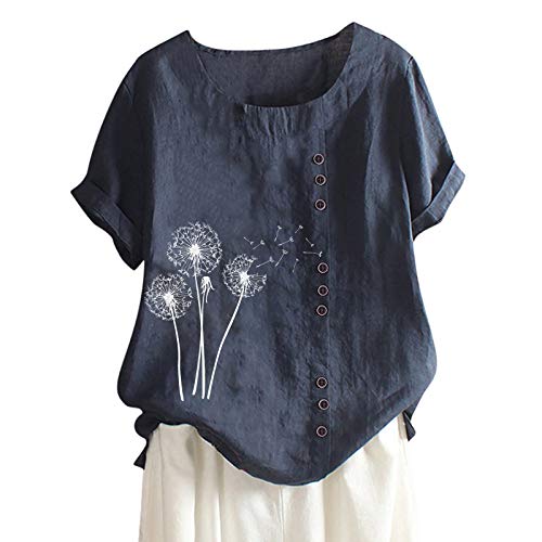 TUDUZ Camiseta de Mujer Verano Elegantes Moda Suelta Blusas Cuello Redondo Manga Corta Botón Superior Camisas de Gran tamaño Tops con Estampado Floral de Mariposas Túnica(JArmada,XXL)