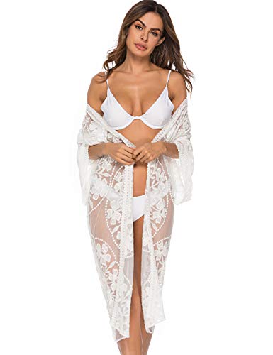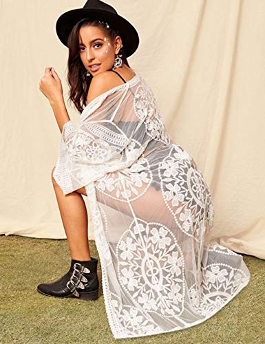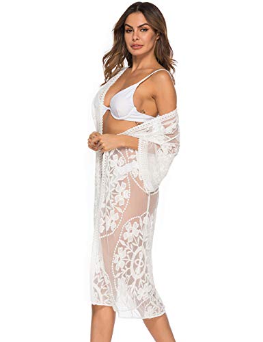 AiJump Caftán floral de encaje de la cubierta del bikini Hasta Bohemia vestido maxi del bañador del kimono para Mujer Talla nica Blanco, Blanco 2