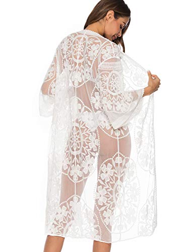 iWoo - Cárdigan kimono sexi para mujer, largo, para proteger del sol en la playa, de encaje floral estilo crochet para cubrirse en la playa. B-blanco Talla única
