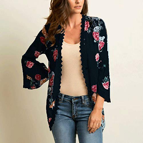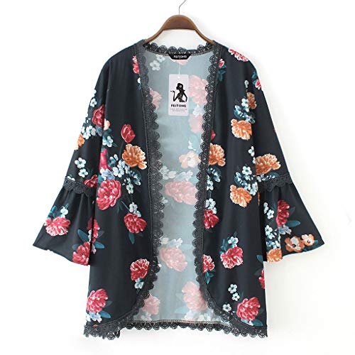 Wyxhkj Mujer Abrigo Verano Estampado De Chifón Gasa Borde De Encaje Kimono Cardigan Suelta Chaqueta De Manga Larga Acampanada Casual (L, Negro)