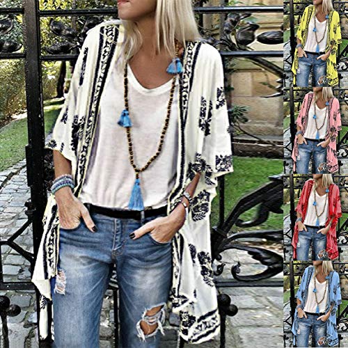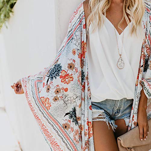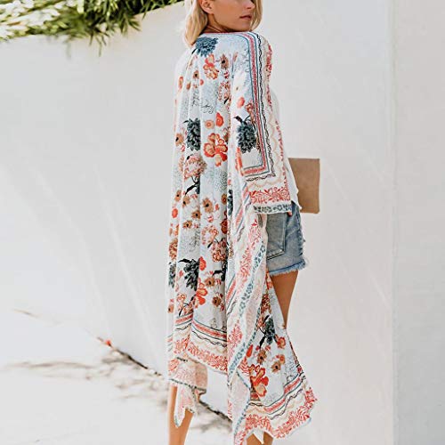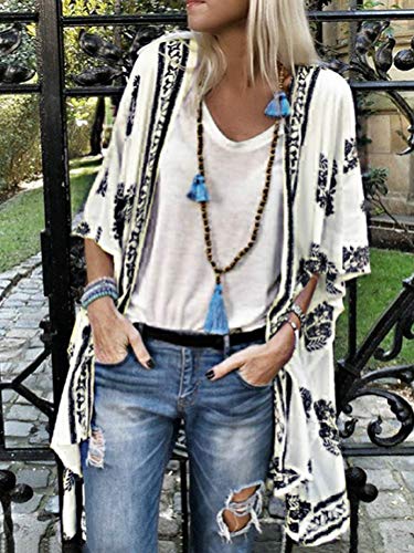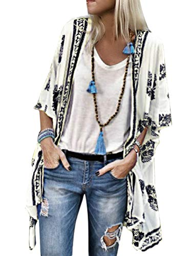 ORANDESIGNE Mujer Cárdigan Kimono Florales Manga 1/2 Tops Blusa Floral Suelta Casual Boho Style Bikini Cover Up Cubierta de Playa Blanco 48