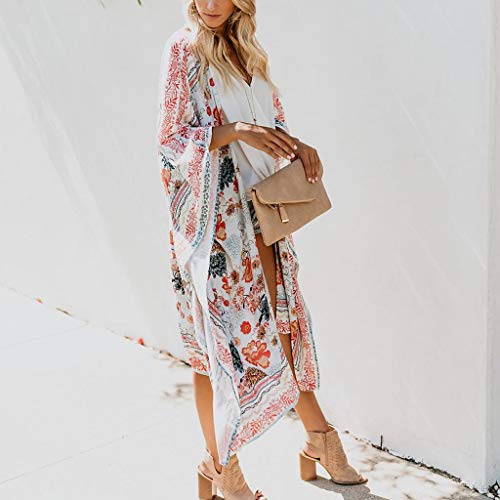 Cardigans Mujer Kimono 2019 Nuevo SHOBDW Pareos Manga Larga Cardigans Mujer Flores Boho Gasa Chal Playa de Verano Cardigans Mujer Largo Suelto Tops Blusa Cover Up Mujer Tallas Grandes(Blanco,5XL)