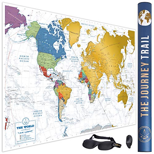 Mapamundi Rascar Para Viajeros Y Familias - Scratch Off World Map Poster, Más Grande Y Con Más Destinos - Incluye Antifaz Para Dormir