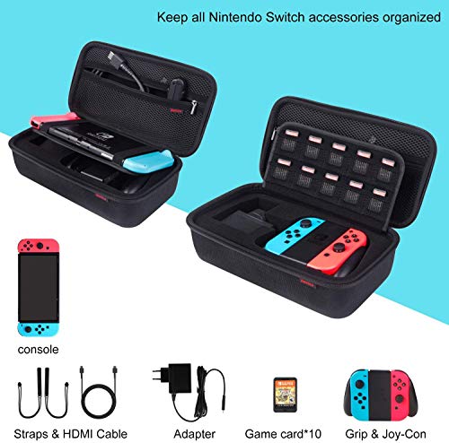 Bestico Funda para Nintendo Switch – Funda de viaje para Nintendo Switch con espacio para guardar 10 cartuchos de juegos para la consola, Adaptador de CA, cable HDMI, mando Joy-Con y correa Joy-Con