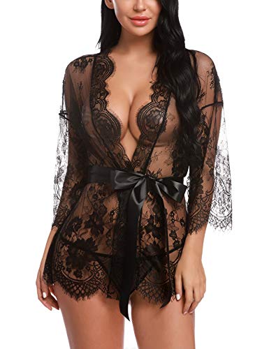 Sykooria Conjunto de Lencería Sexy para Mujer Pestaña Babydoll Frente Abierto Camisón de Encaje Floral Chaquetas Vestidos Malla Transparente Malla de Encaje de Media Manga