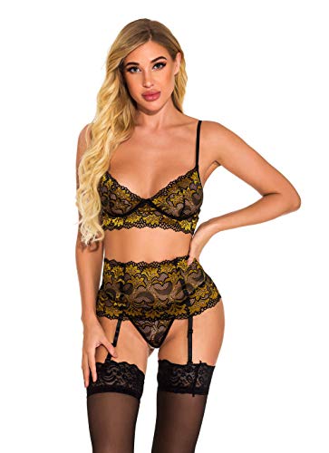 Sykooria Conjunto de Lencería Sexy Hueca Tirantes de Encaje Transparente Sujetadores con Liguero y Tanga Body Ropa de Dormir