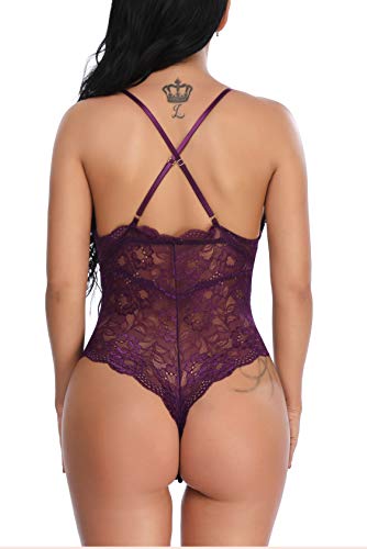 EVELIFE Sexy Lencería Mujer Encaje Teddy Body Profundo V Ropa Interior Snap Crotch Ropa de Dormir(Púrpura M)