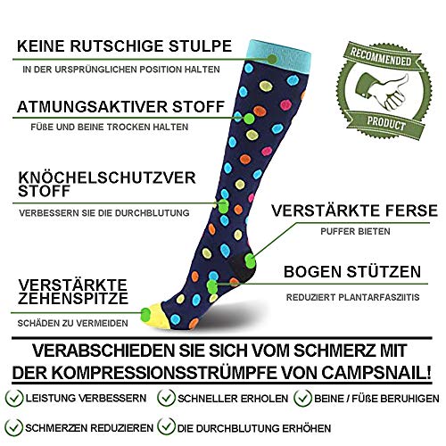 - Innovación en terapia de compresión: nuestros calcetines de compresión son tan diferentes de los calcetines de compresión tradicionales, porque adoptamos el más alto estándar de producción de calcetines deportivos profesionales, mejorando la circulación del aire y manteniendo tus pies secos y cómodos todo el tiempo. Nuestros calcetines de compresión mejoran la circulación sanguínea, garantizan una restauración más rápida, alivian las venas varicosas o la hinchazón y protegen tus pies mejor.