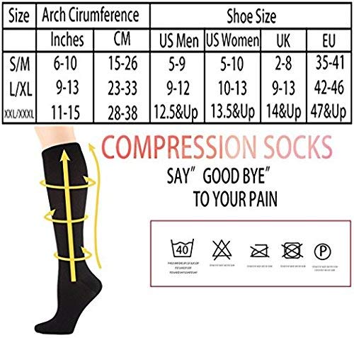 - Nuestros calcetines de compresión están hechos de material de alta calidad. Si encuentras algún problema de calidad, podemos garantizar que te devolveremos todos los reembolsos. El tamaño de los calcetines puede tener un poco de error para diferentes personas, esperamos que puedas mirar cuidadosamente cuando lo elijas. El diagrama de tallas se muestra en la parte izquierda.