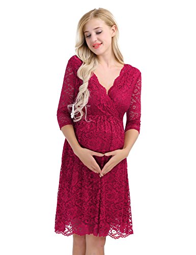 Vestido Premamá, Largo de Encaje de Mujer Embarazada, de Maternidad Apoyos de fotografía Ropa Larga Maternidad y de Lactancia (Vino Rojo, L)