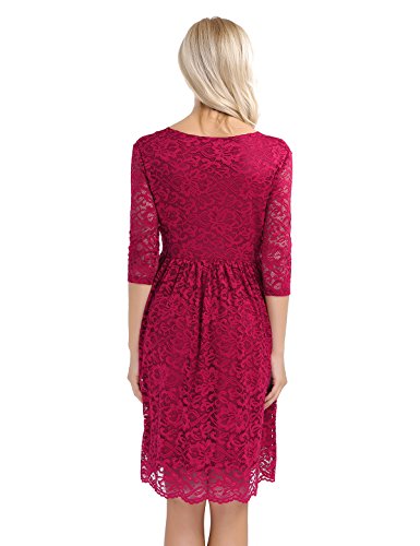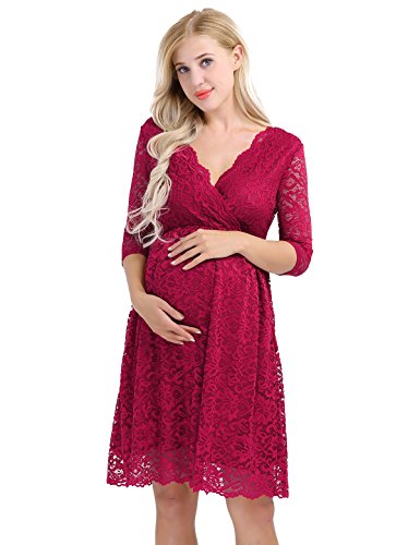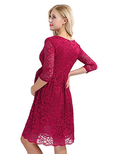 IEFIEL Mujer Premamá Vestido de Maternidad Encaje Vestido de Embarazada Encaje Floral Vestidos Boda Fiesta Corto Verano Manga Corta Rojo Vino XX-Large