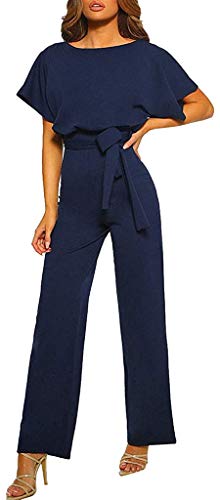 Largos Elegante Verano Tallas Grandes Mono de Manga Corta señoras Jumpsuit Monos Mujer Fiesta Playsuits con Cinturón de Lazo Clubwear Monos (Armada,L)